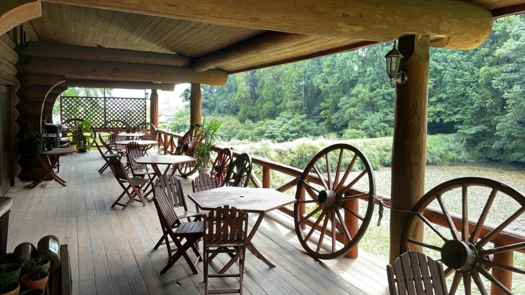外観は、北米の風情あふれるログハウス。木の温もりと香りが漂う空間は、訪れる人の心をふっとほどいてくれます。テラス席は5席あり、自然の風を感じながら食事を楽しめるとあって、特に人気のスペースです。