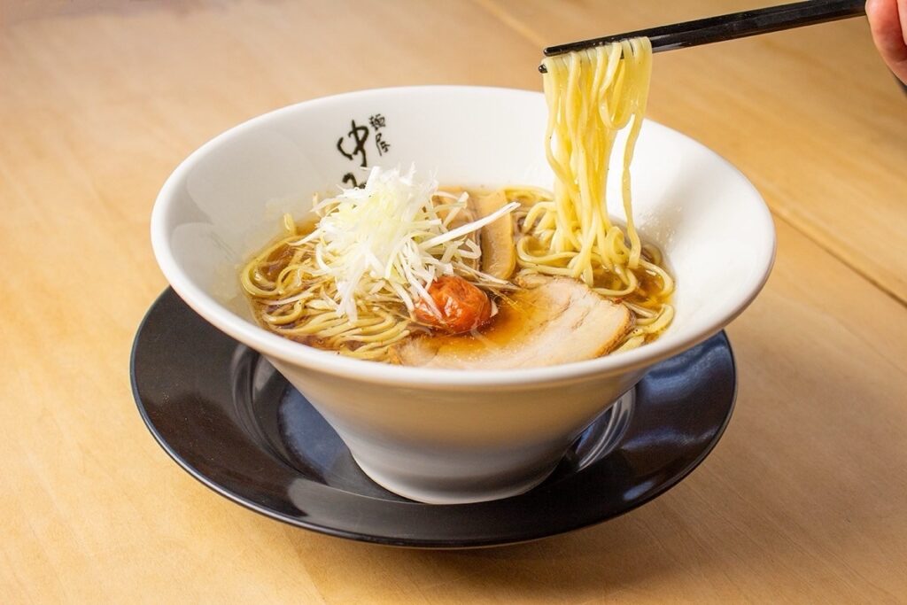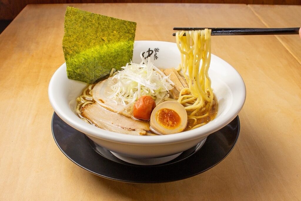 • 魚介醤油ラーメンは、長崎産の鰹削り節をふんだんに使った魚介系スープが自慢。梅干しが入っているので、スープを楽しんだ後に梅を崩すと酸味と風味が広がり、2段階の味変が楽しめます。