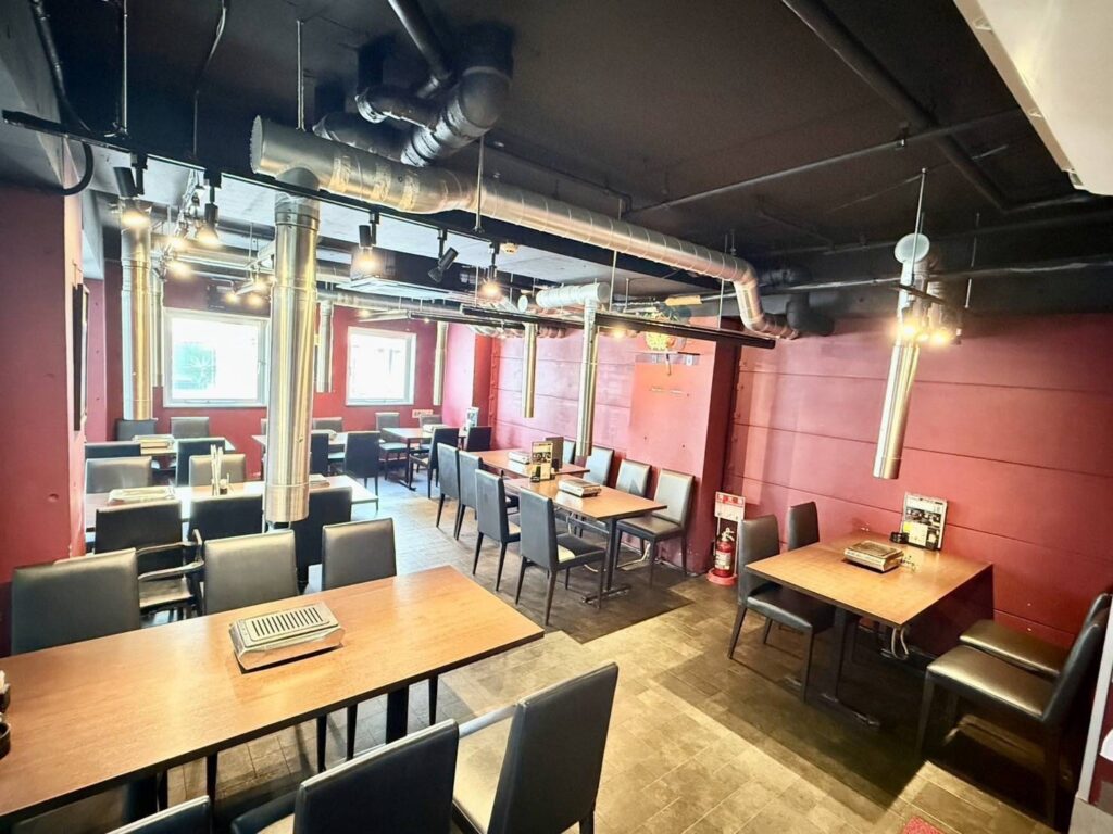 ウッディなテーブル8卓とボックス席が並ぶ店内は38席。焦げ茶の木目と漆黒の排煙ダクト、レンガ調クロスが醸す温かな雰囲気が心地よい。2名向けのハイバックソファ席は横並びデートや誕生日利用にも最適で、週末には子ども連れのファミリーもゆったりと食事を楽しむ。天井まで伸びる強力ダクトが煙を即座に吸い上げるため匂い移りも最小限。20名以上で貸切ができ、会社宴会にも重宝される。