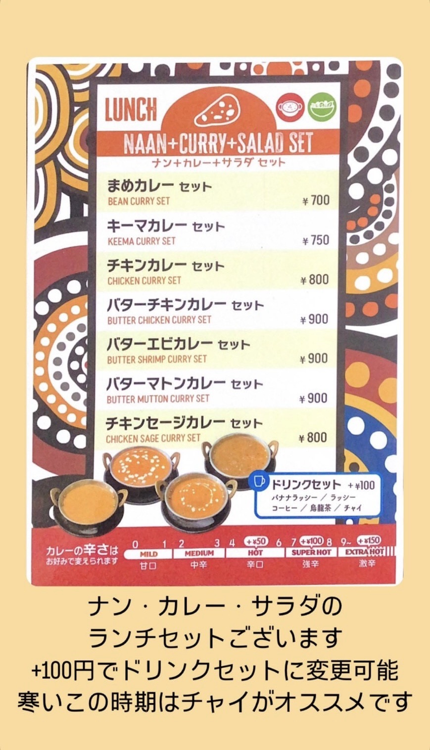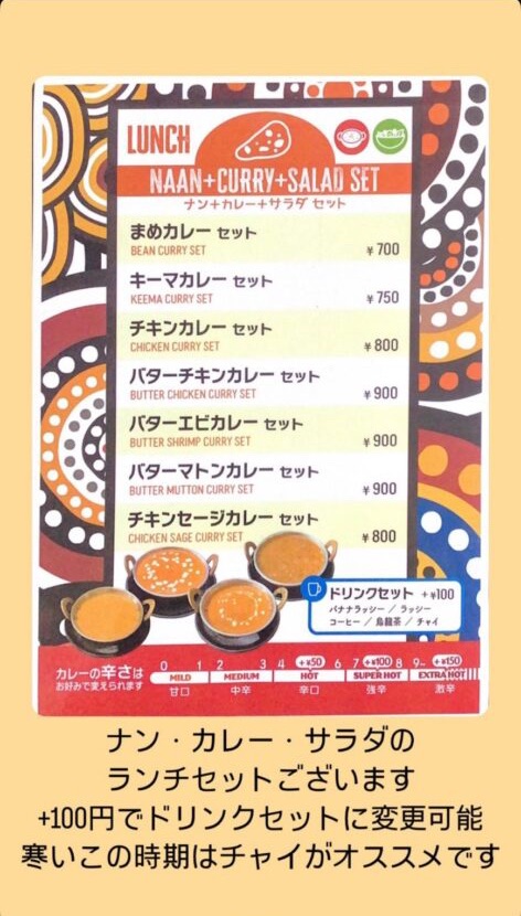 ランチセットも豊富で、ナンやライスにカレー、サラダが付いて、ご飯もスパイスも満足感があります