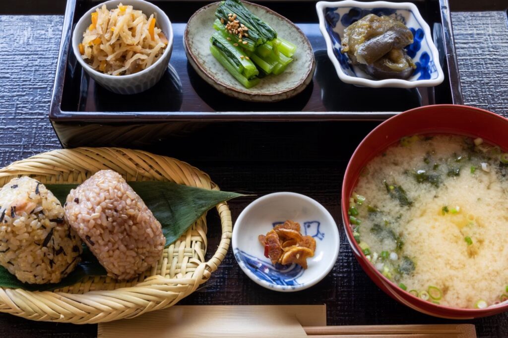 おむすびと一緒にほっと一息つける温かなお茶や、栄養バランスを考えた惣菜は、ランチや軽食にぴったり。