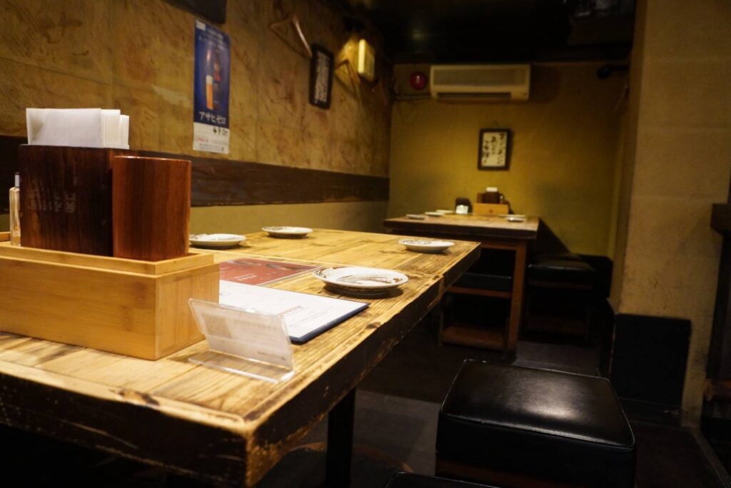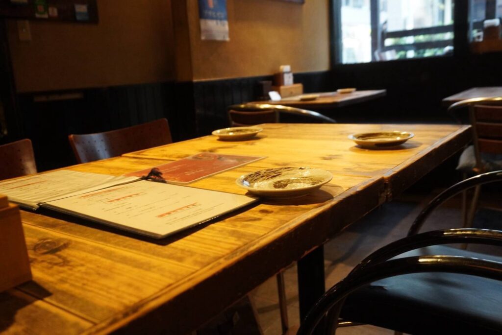 木の温もりを生かした和の空間。カウンターからは備長炭で焼かれる串の様子が見え、香ばしい匂いが食欲を誘う。テーブル席やテラス席もあり、会社帰りの集まりや家族の食事にも馴染む。賑やかさとカジュアルな居心地の良さのバランスがいい。