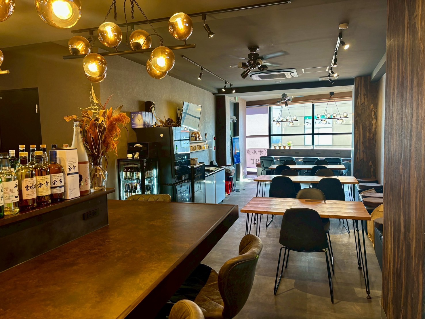 店内はカウンター席とテーブル席を合わせて約18席。木目を基調とした温かみのある空間に、大きな窓から自然光が差し込み、落ち着いた雰囲気を演出している。全席に電源と無料Wi-Fiを備え、仕事帰りの一杯や長めの食事にも使いやすい仕様だ。窓際の席からは志木の街並みを望むことができ、デートにも好適。さらに、店内には小さな物販コーナーが設けられており、料理に使用される干物や塩鰹、調味料などをお土産感覚で購入できるのも特徴だ。