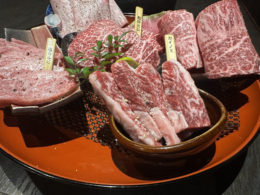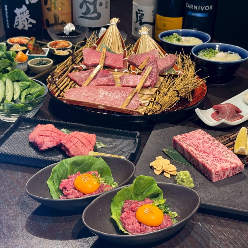 目の前でバーナーを操る『炙り寿司』は香ばしさととろける脂が渾然一体。『厳選和牛5種盛り合わせ』で希少部位を少量ずつ堪能し、厚切り『ネギタン塩』は葱塩だれが爽快。海鮮やユッケも入るコースが充実。