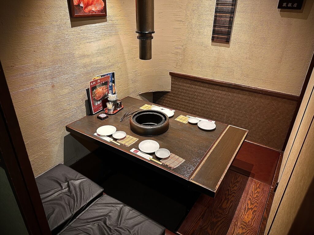 床に埋め込まれた間接照明が通路を導き、ダークウッドの壁と黒革のベンチが落ち着いたムードを醸成。掘りごたつ半個室はデートや接待に適し、カウンターはスタッフとの会話を楽しむ一人焼肉にも重宝。全卓ダクト完備で煙を吸い、服装は自由なので仕事帰りでも気負わず入店できる。地下ながら天井高はゆとりがあり閉塞感を感じさせない。