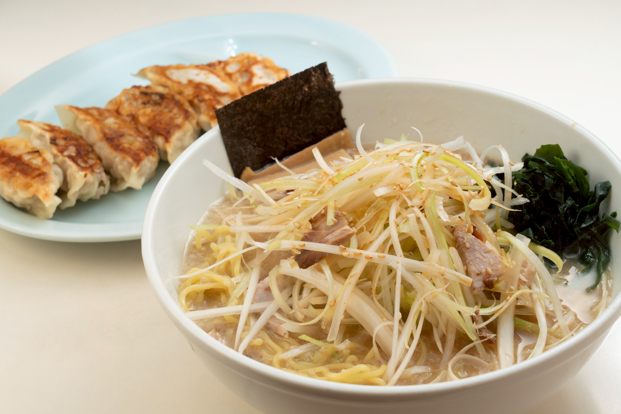 看板のねぎラーメンは、白髪ねぎがたっぷり乗った香り高い一杯。マイルドな豚骨スープにシャキシャキのねぎが絡み、醤油味・味噌味どちらもコク深く、さらに麺は細麺・太麺・ストレートの3種類から選べる自由度も人気です。ラーメンとねぎ丼を同時に楽しめるラーメンセットや、チャーシューエッグが乗ったまかない丼、また、ビール餃子を一緒に楽しめるビールセットも好評です。