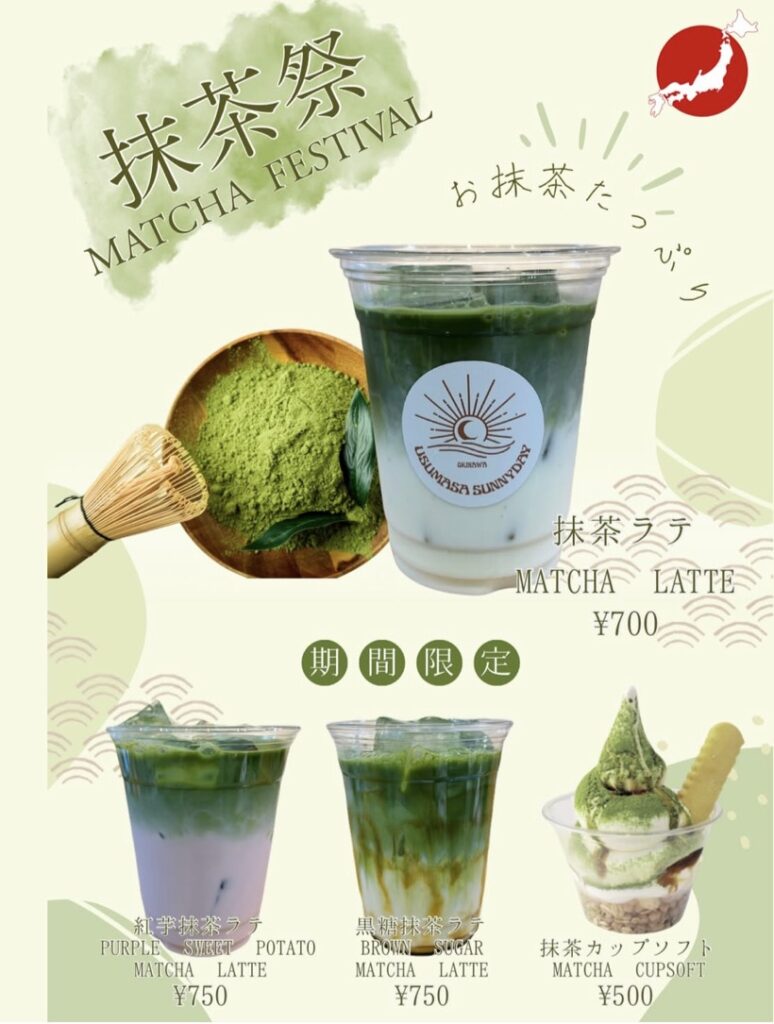 USUMASA SUNNYDAYの人気を語る上で外せないのが、こだわりの抹茶を使ったスイーツ。深みのある風味と上品な香りが特徴で、甘さを控えたバランスの良い味わいがファンを惹きつけています。