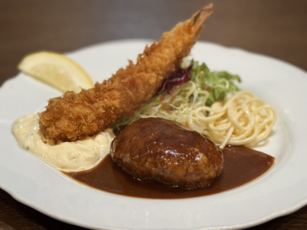 ・ハンバーグとエビフライプレート