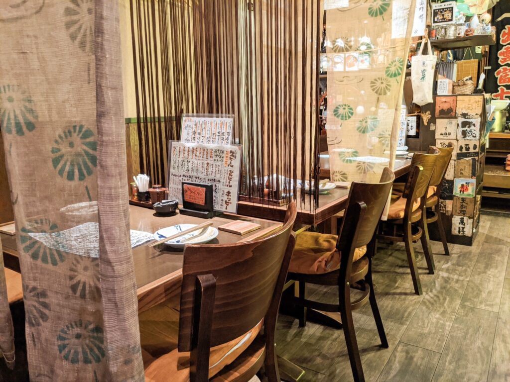 店内は「和」を基調とした落ち着いたデザインで木の温もりと柔らかな照明を組み合わせた空間が広がっている。