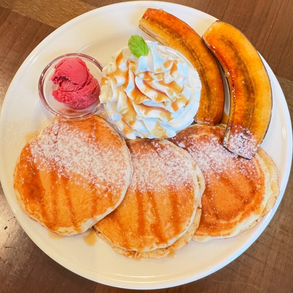 紅いもを使ったパンケーキや、バナナをキャラメリゼした甘い系の一皿、ベーコンや卵を合わせた食事系パンケーキなど、幅広いラインナップが揃います。