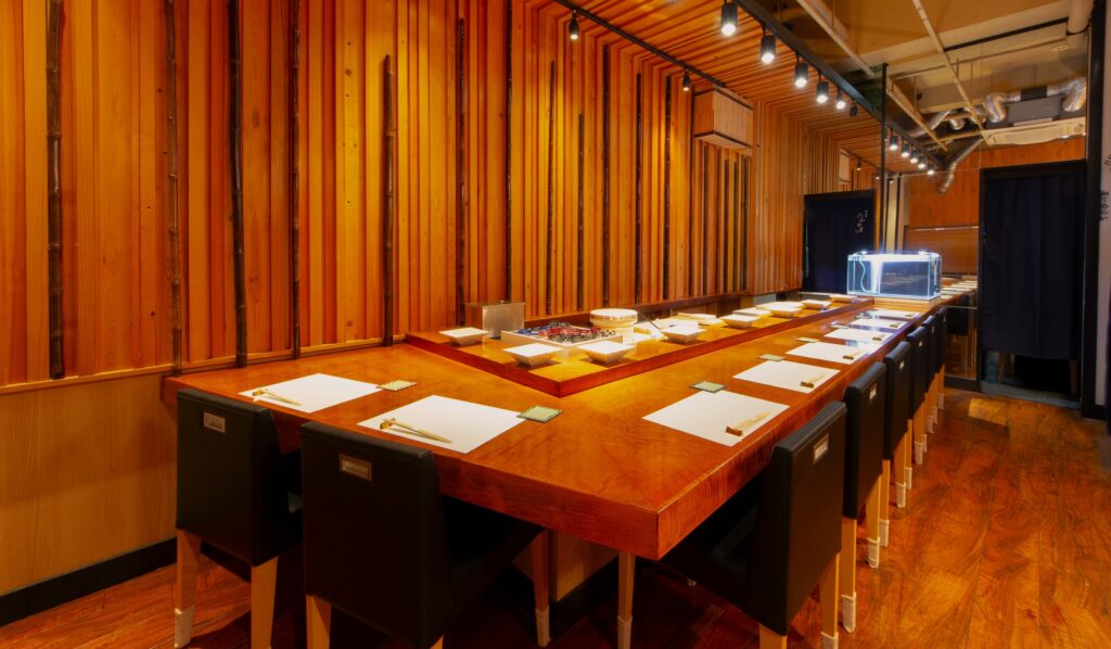 木目調を基調とした和の空間は、目の前で職人の技を楽しめる特等席です。