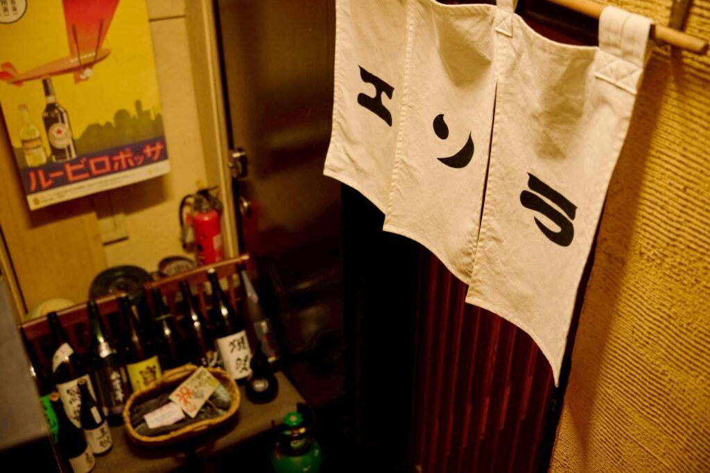 店舗は地下にあり、10坪ほどの店内に、カウンター9席と4名掛けテーブル2卓を設け、全18席を配置。